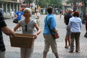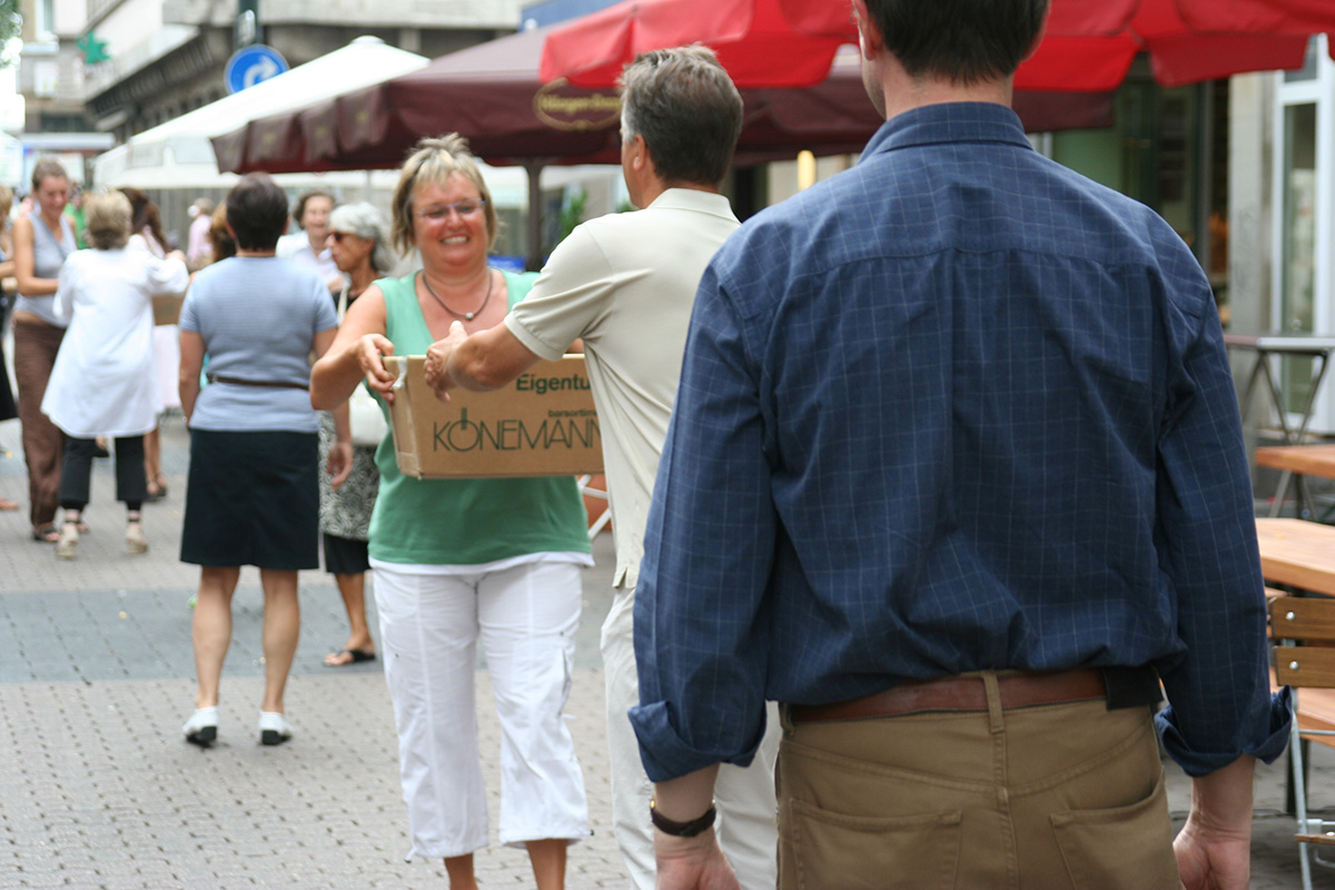 Mehr als 100 Kunden haben beim Umzug im August 2006 von der Neustraße in die Bolkerstraße mit einer Bücherkette quer durch die Fußgängerzone geholfen.