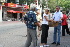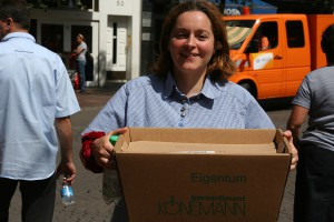 Mehr als 100 Kunden haben beim Umzug im August 2006 von der Neustraße in die Bolkerstraße mit einer Bücherkette quer durch die Fußgängerzone geholfen.